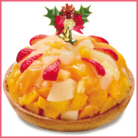 タルトにホイップカスタードを絞り、黄桃、白もも・洋ナシ・パイン、苺の5種類のフルーツを楽しめるクリスマスケーキです。