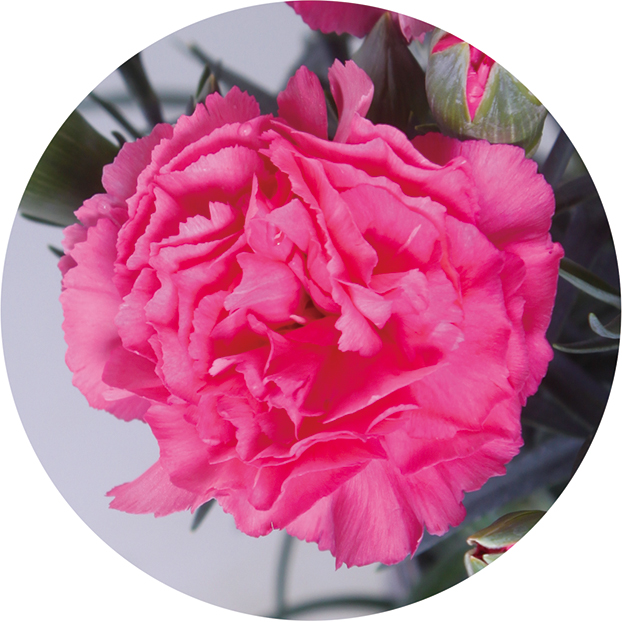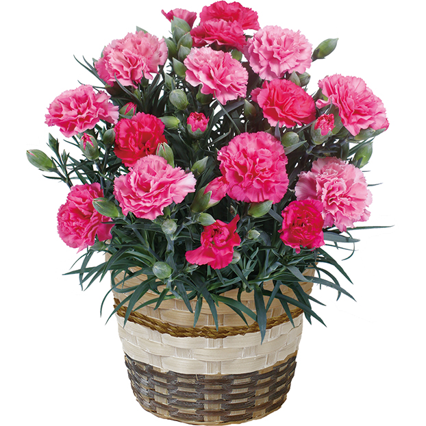 グラデーションが楽しめる 咲き始めの濃いピンクから淡いピンクへと移ろう愛らしいカーネーション。グラデーションがお楽しみいただけます。※カゴのデザインが変更になる場合がございます