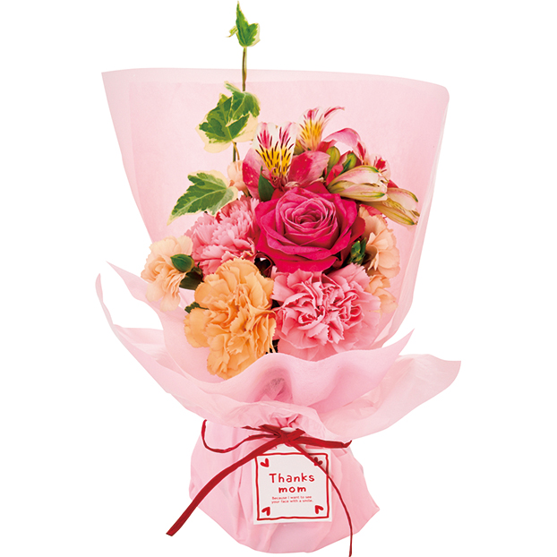 ピンク系のバラとカーネーションで可愛らしいブーケに仕立てました。花瓶いらずでそのまま飾れます。