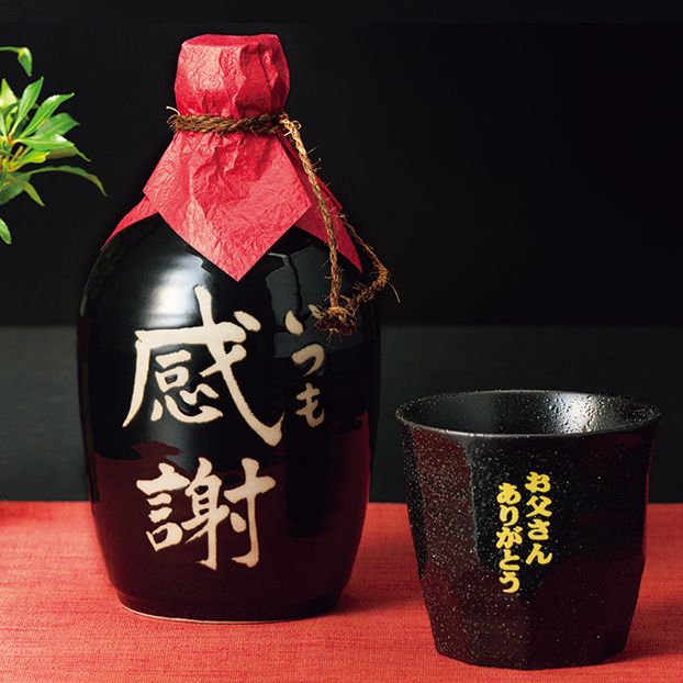 麦焼酎を樽内でじっくりと熟成させた「いつも感謝」と、父の日陶器オリジナルグラスのセットです。