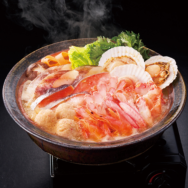 紅ずわいがにをはじめ、鮭、タラ、ホタテ、エビなど海の幸を多彩に盛り込んだ海鮮鍋のセット。様々な具材の旨味が鍋の中で一つになるおいしさを満喫していただけます。