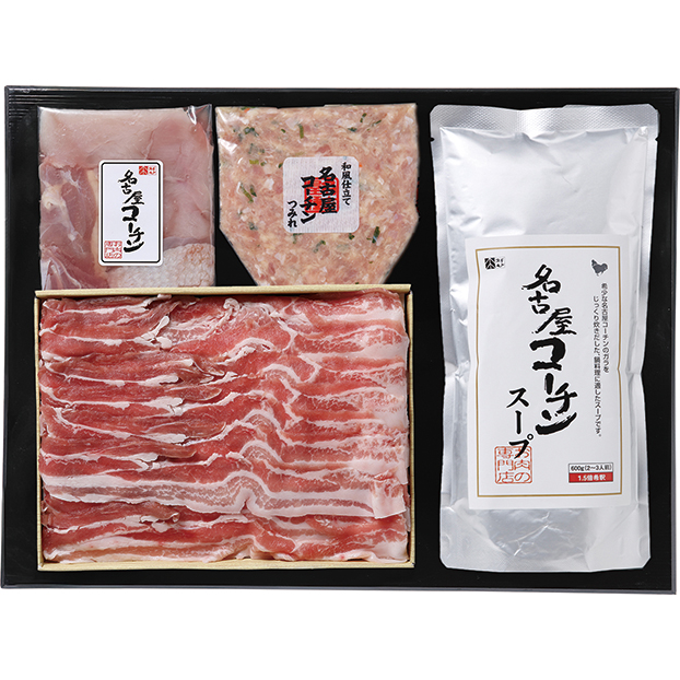 豚バラ肉240g、名古屋コーチンモモ肉とムネ肉切身200g、名古屋コーチンつみれ200g、名古屋コーチンスープ600ml