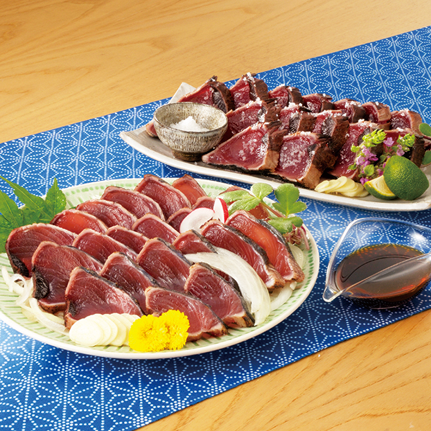 一本釣りで漁獲した戻り鰹を土佐伝統の藁焼きでたたきに仕上げました。ゆず風味のたれと特産の天日塩付で食べ比べできます。
