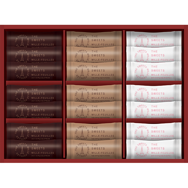 ミルフィーユ×21(ミルクチョコ&キャラメル・ホワイトチョコ&ストロベリー・スイートチョコ&プラリネ×各7)