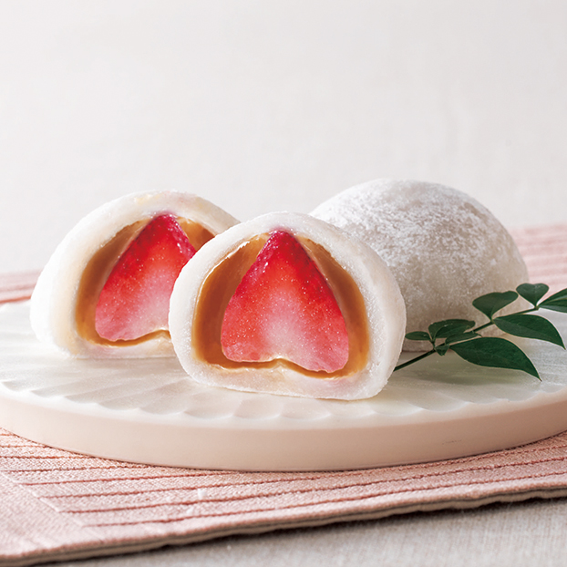 酸味のあるイチゴととろっと感がたまらないキャラメルソースを、国産もち米を使用した羽二重餅で包み込んだ贅沢な大福です。