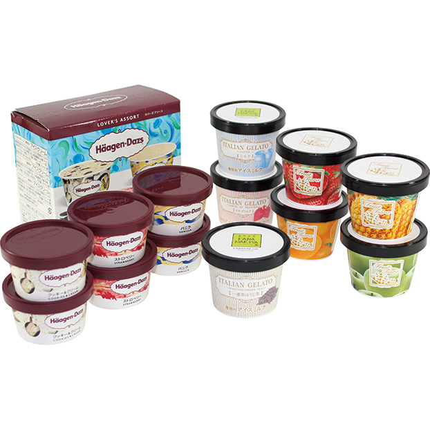 ハーゲンダッツラバーズアソート(バニラ・ストロベリー・クッキー&クリーム)各70ml×各2、KAMANARIYAイタリアンジェラート(ミルク・抹茶・苺ミルク各100ml×各1)、フルーツティアラソルベ(イチゴ・青リンゴ・パインアップル・ミカン各108ml×各1)