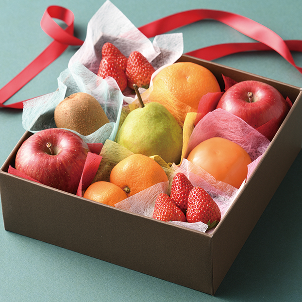 サンふじ×2(青森または長野産)、ラ・フランス×1(山形または秋田または青森産)、紅まどんな×1(愛媛産)、いちご×4~6(静岡または愛知または福岡産)、富有柿×1(岐阜または奈良または和歌山産)、みかん×2(静岡または和歌山または愛媛産)、キウイ×1(ニュージーランドまたは愛媛または山梨または長野産) ※天候状況等によりお届け期間・産地・果物の内容が変更になる場合があります