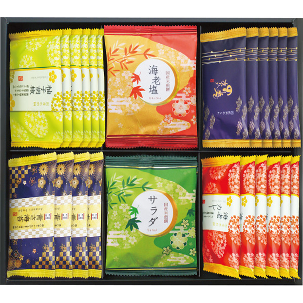 のり巻あられ・柚子胡椒煎餅・海老カレー煎餅×各6、青さ海苔煎餅×4、海老塩煎餅・サラダ煎餅×各3