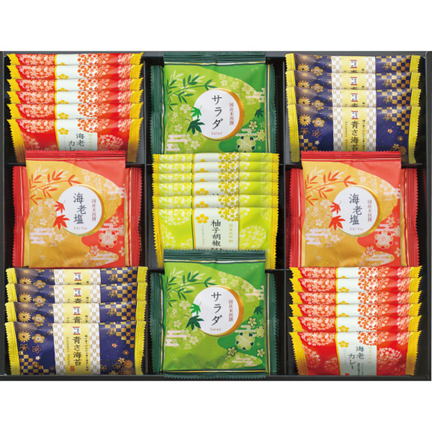海老カレー煎餅×12、青さ海苔煎餅×8、海老塩煎餅・サラダ煎餅・柚子胡椒煎餅×各6