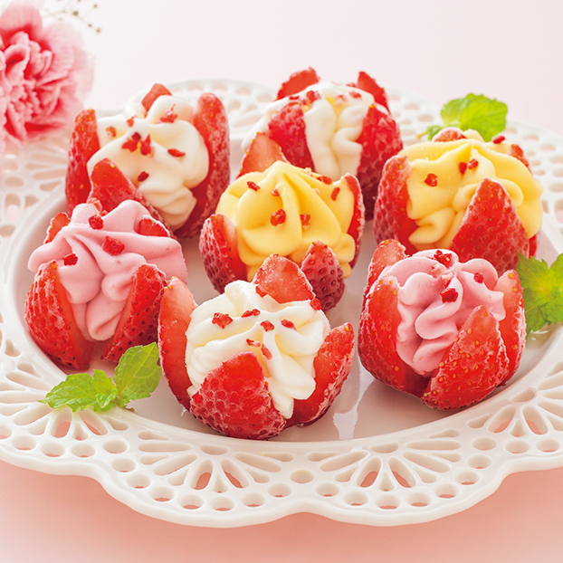 花のように開いた博多あまおうの中に練乳、イチゴ、マンゴーの3種類のアイスをのせました。