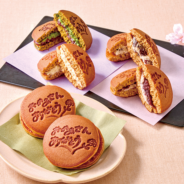 4種類の生どら焼きに感謝の気持ちを込めたメッセージの焼印をつけてお届けします。